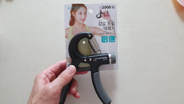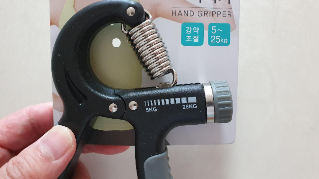 다이소에서 다양한 악력기가 있었지만 이 제품을 선택한 이유는 강약조절이 가능하다. 가장 적은 무게는 5kg이고 무게를 높이면 25kg까지 증량할 수 있다. 악력기를 열심히 하다보면 아무래도 팔 힘이 딸리 때가 있다. 그러면 악력을 약하게 조정해서 남은 힘마저 뽑아주면 너무 좋다.
